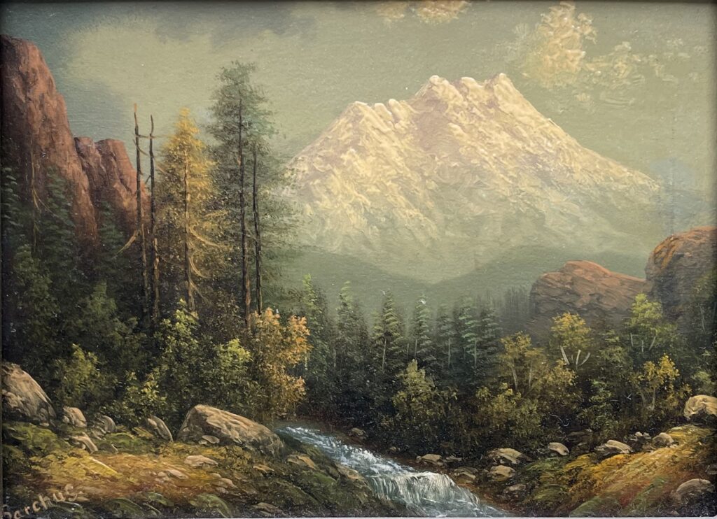 Eliza painted this scene of Mt. Shasta consistently over her long career. Mt. Shasta, along with Mt. Hood and Mt. Rainier, were undoubtedly her most frequent sales and as a result they show up in the market most frequently. Unfortunately, the cascading streams in many of these Mt. Shasta paintings has mechanical feel, which causes the water to look unnatural.