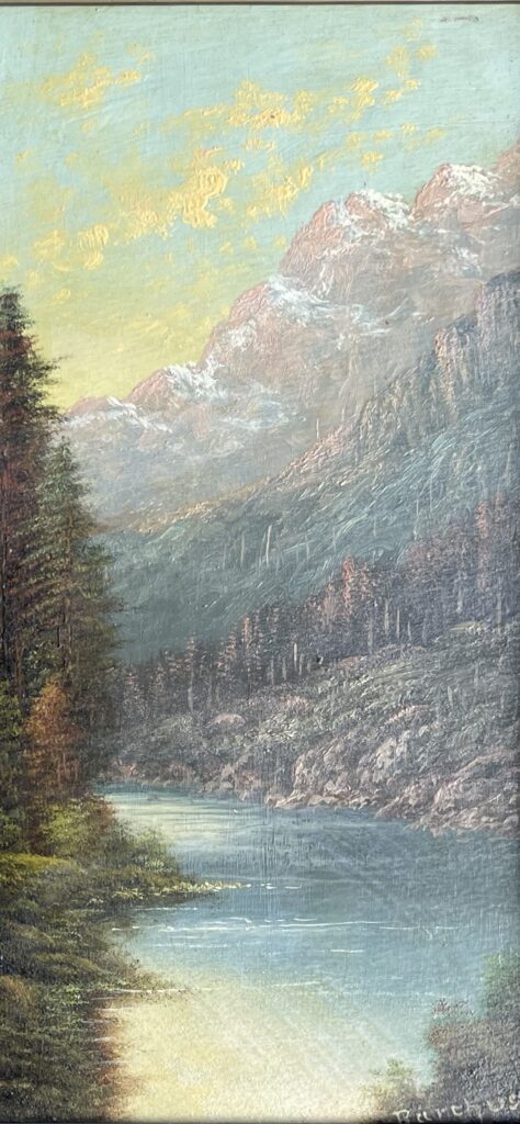 Based on a similar painting that is pencil inscribed in the artist’s hand, Mrs. Barchus gave the title Around the Bend in Alaska to this scene. However, it is not known which river is depicted. This painting was likely painted a few years after her visit to Alaska, as it looks like a later painted version of the other painting in this Gallery Index with the same title. (See Around the Bend, Alaska #1.)