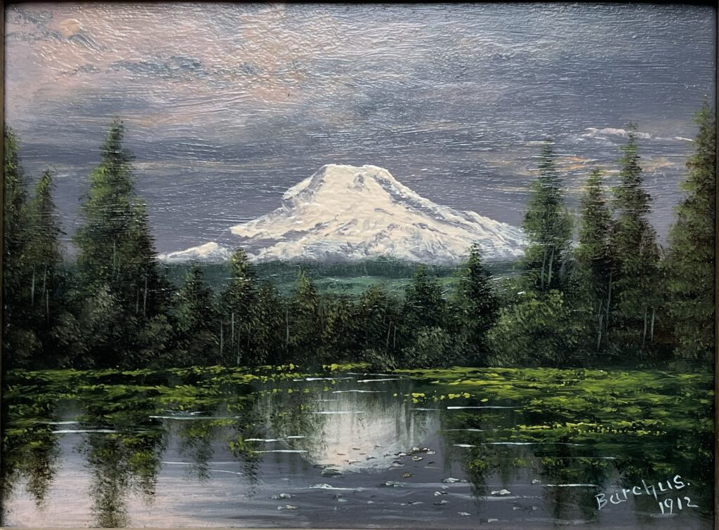 Mt. Adams is located in the south-central portion of the state of Washington yet visible from vistas around Portland, Oregon, area. Barchus seldom dated her paintings, but this one is dated 1912.