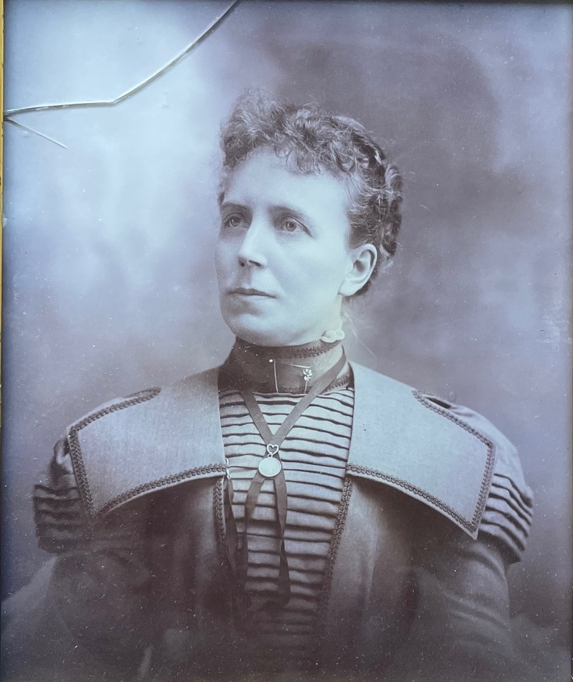 This portrait of Eliza must have been a favorite of hers as she used it in her advertising materials throughout her career. The exact date she sat for this picture is not known but it was most likely ca. 1898 – 1890. The photographer was Parker Studio in Baker, Oregon, a town that she visited at that time to teach classes in painting. In the fall of 1887, she won a gold medal at the Portland Mechanics Fair. It is that medal Barchus is wearing on the ribbon necklace. The dime-size medal is extant and still retains the gold heart attached to it.