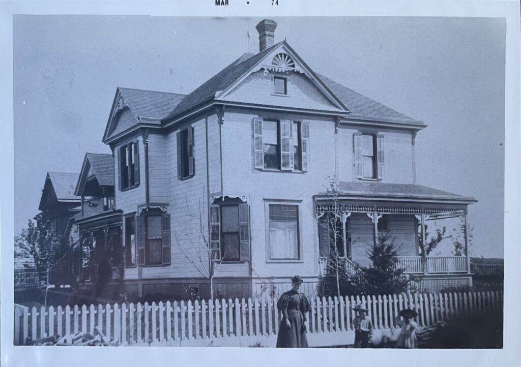 Eliza built the first of six homes in 1892. This one and the second home, partially seen at the far left (last roof gable), were of Victorian style. This photograph was taken in 1908. Eliza is in front with her two young children – Harold and Agnes. Unfortunately, this grand house was destroyed by fire.