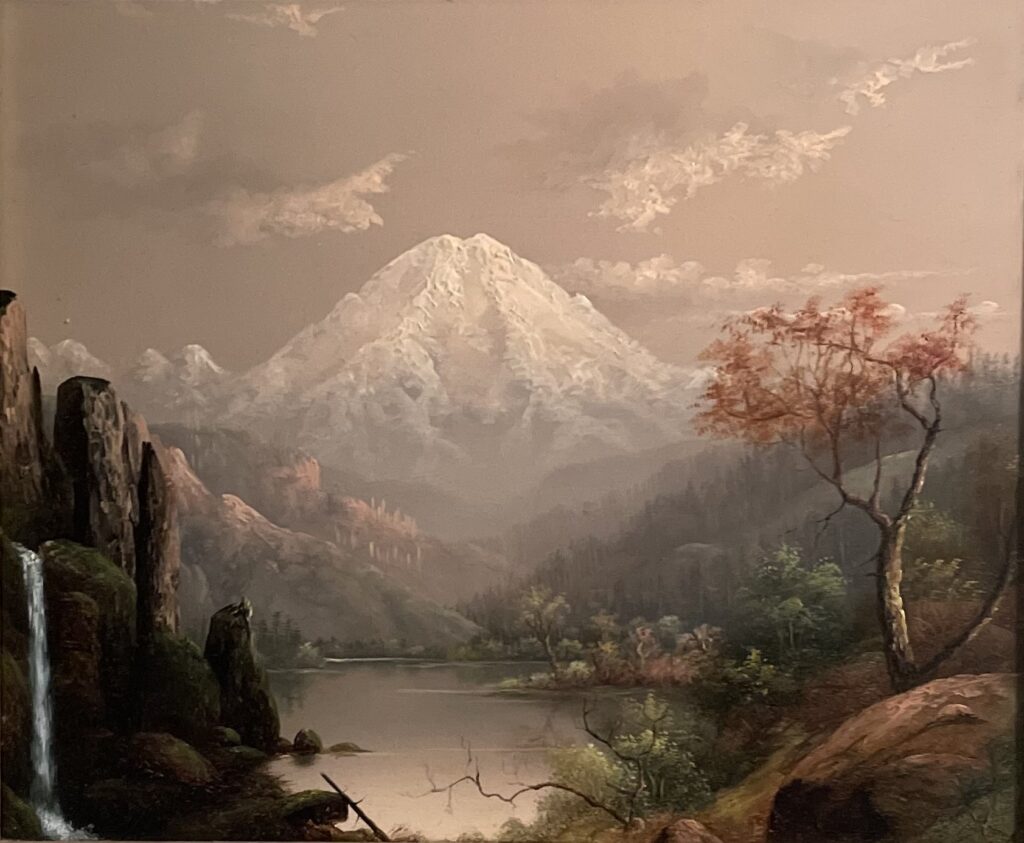 This painting, with a beautiful waterfall on the left side which provides balance to the large tree on the right, is a unique Mt. Rainier painting by Barchus. It is also an early work by her. On the panel’s reverse she wrote “Mt Rainier WT 14,444 feet high.” As Washington did not become a U.S. State until 1889, this painting predates that date.