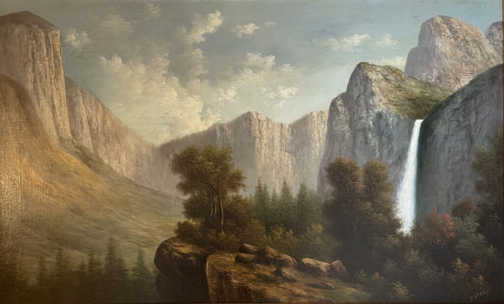 This painting, likely painted soon after her visit to Yosemite in the summer of 1914, was held in the Barchus family until 1972 when it was sold to a Cleveland, Ohio art collector.  Agnes Barchus documented much of the family painting collection in the early 1970’s as she was preparing to write her mother’s biography Eliza R. Barchus: The Oregon Artist and this canvas was imaged in that effort, and she gave the painting a slightly different title: Yosemite from Artist Point.  In all likelihood, this may be the only canvas she painted from this Yosemite viewpoint.