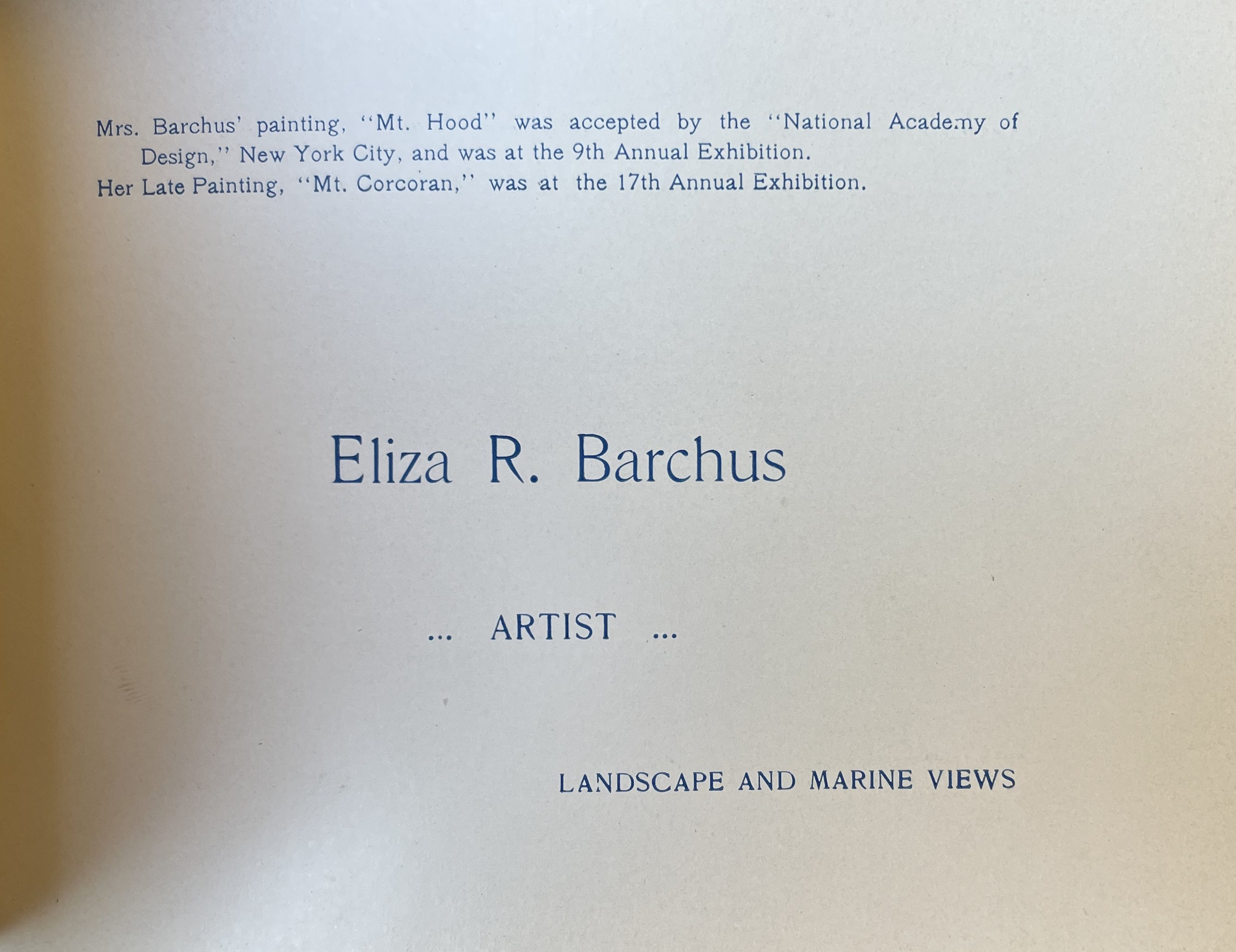 The 1901 Portland Blue Book holds a mystery. In this edition of this annual publication Barchus had a full-page advertisement. In it she promotes herself by noting that she exhibited her Mt. Hood painting at the National Academy of Design 9th Annual Exhibition (1890). She also states that her painting of Mt. Corcoran was exhibited in the National Academy’s 17th (1898) annual show. Additionally, a receipt from a New York art company confirms that Barchus had delivered a framed Mt. Corcoran painting to the city at the time. (See [[.) A search of National Academy of Design exhibition records do support the Mt. Hood painting being exhibited but not a Mt. Corcoran. The 1901 directory would have gone to print by late 1900, nearly a year after the 1898 NAD show had occurred. Is it possible that the Barchus painting in this year did not get included in the NAD records?