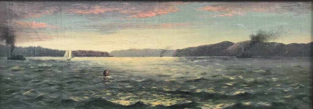 This painting is labeled in ink on the stretcher Marine at Pont (sic) Loma, Calif but NOT in the artist’s handwriting. A Los Angeles Times clipping dated Dec 23, 1894, mentions an exhibition of Barchus paintings in the city and references one painting with this title. Under the caption of Grandeur of Nature, is written (in part): ‘A large number of this lady’s latest works of art have just arrived, and are being daily examined by all lovers of the beautiful and realistic. The paintings are mostly scenes of California, among them being the “Wood Scene” in Sonoma Creek; “A Marine” at Point Loma, San Diego County; “Pyramid Lake” at Sunset, Nev.; “Arch Rock” Mendocino coast; “San Antonio Canyon, with Old Baldy in the Distance,” and many others as equally charming. These paintings were being exhibited at the art emporium of H. C. Lichtenberger.’ Due to this information, it was previously thought that this canvas portrayed this scene.