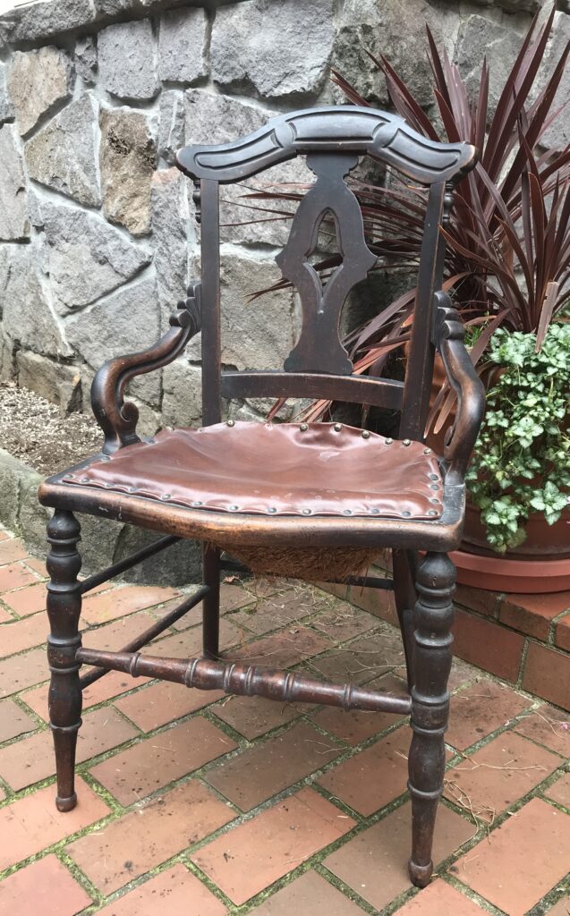 This was the chair Mrs. Barchus sat in to paint, as documented in the photograph showing her siting in it while painting two small Mt. Shasta paintings in her studio. (See Portrait of Artist – Age ~47.) The chair was kept by Agnes Barchus until she sold the family art collection to Mr. Joe Erdelac, a Cleveland, Ohio, art collector. The chair has subsequently returned to a northwest owner.