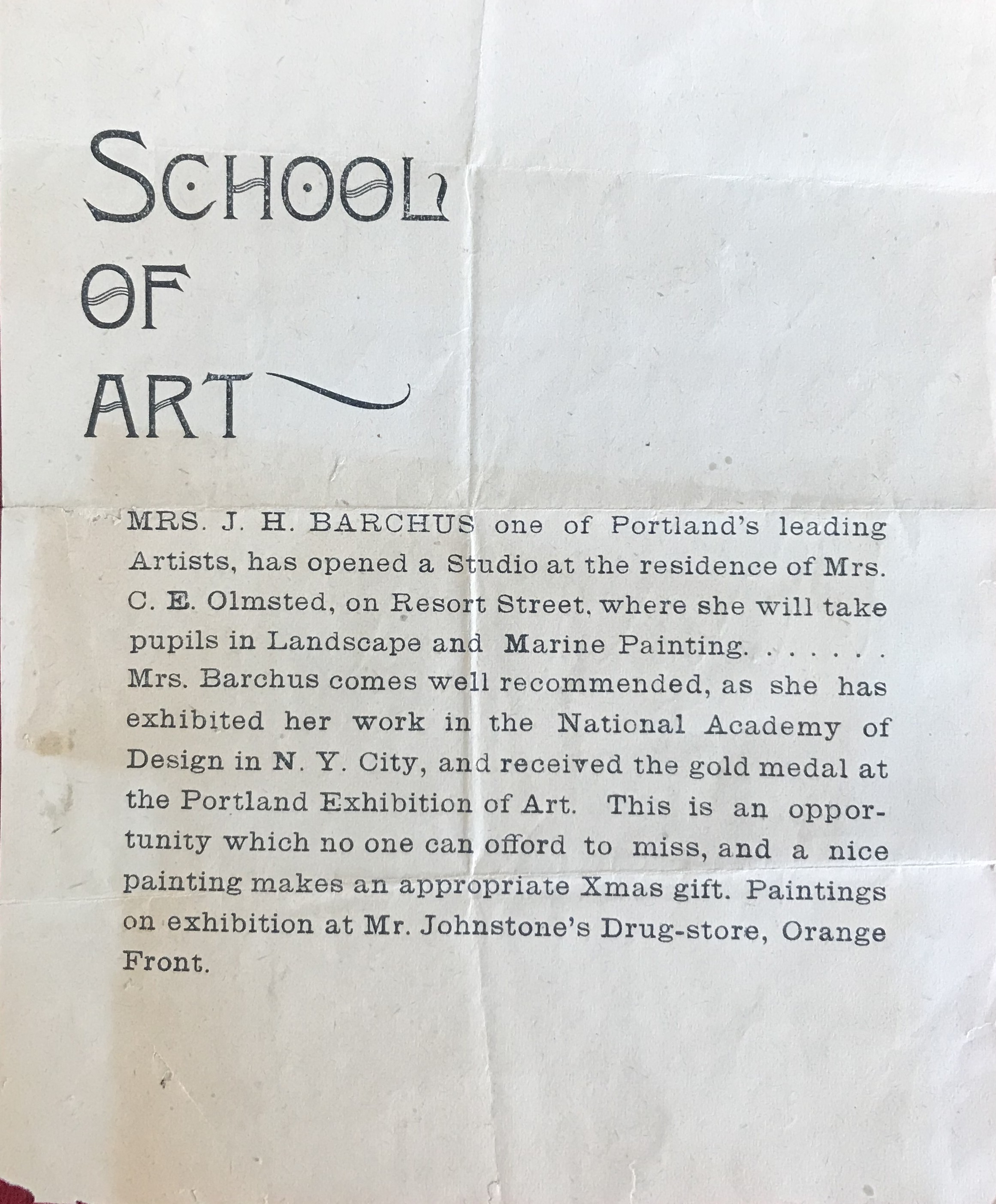 It hasn’t been determined in which city Barchus used this advertising leaflet to promote her teaching lessons in painting. The clue of “Mr. Johnston’s Drug-store, Orange Front” has not yielded the answer as of this writing. The document is on thin paper and measures 5 7/8 x 4 7/8 inches.
