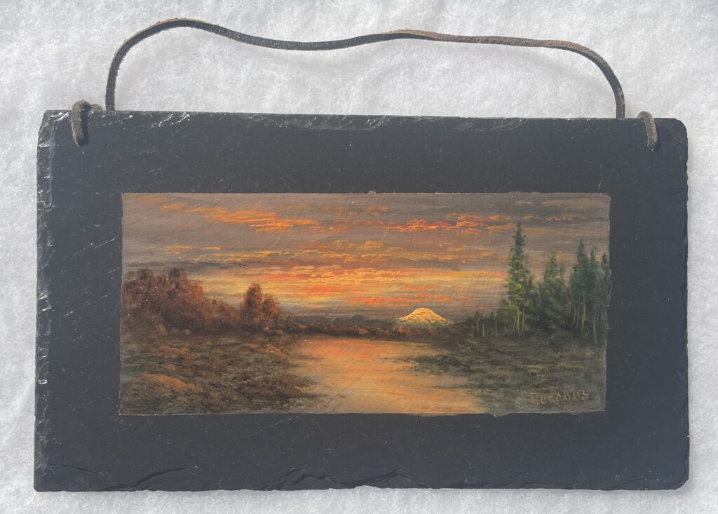 This painting is unusual in both its scenic composition and the non-standard slate rock surface that it is painted on. Mt. St. Helens, in her symmetrical “ice cream cone” beauty, is obviously the snow capped mountain in the background but from what vantage point Mrs. Barchus painted it from is not known.