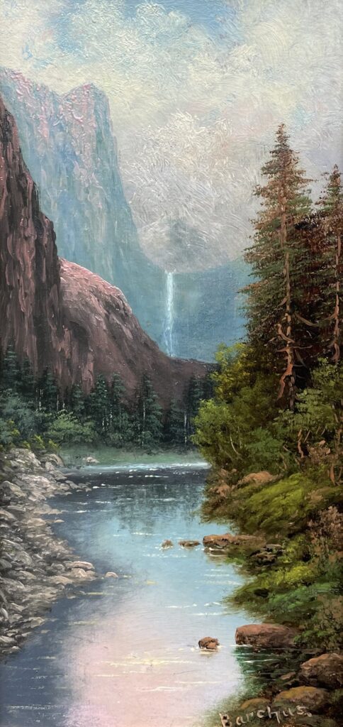This image is nearly identical to Unknown (Waterfall #1), though Barchus painted in some additional rocks in the stream on this piece for more visual depth. The painting has the “feel” of Yosemite, but no good visual matches have been located to confirm this waterfall location.