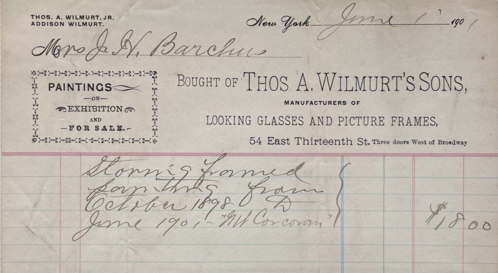 This invoice, from a New York City picture framing company, documents that Barchus had delivered a framed Mt. Corcoran painting to the city around the time of the National Academy of Design’s 1898 autumn exhibition. An entry in the Portland Blue Book further states that a Mt. Corcoran painting was exhibited that year. (See Portland Blue Book (1901).) However, records of the National Academy of Design to not indicate the painting was exhibited.