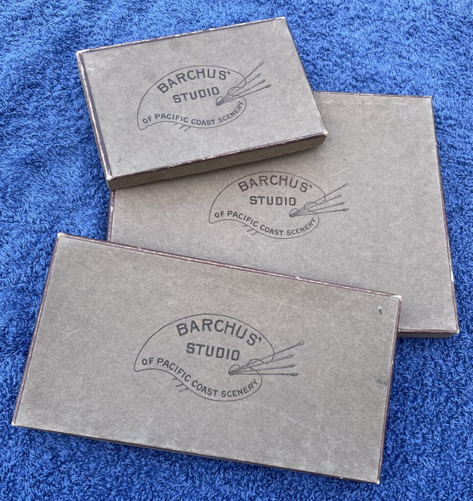 Eliza sold her paintings unframed. However, for her smaller works, which were almost always completed on art board, she provided a studio gift box. These were in various sizes that matched her standard painting dimensions. The pictured boxes above fit 3.25″ x 5.25,” 4″ x 8″ and 6.50″ x 8.50″ sized paintings. Other box sizes accommodated 10″ x 12,” 7″ x 14″ and larger paintings. Likely for the purpose of reordering box inventory, she kept the printer’s ink stamp that produced the artwork on the box lid box. (See Studio Box Ink Stamp on another page within this Ephemera Index.)