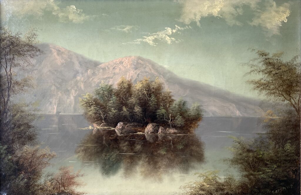 Two paintings of this scene are known to exist. The previous owner of one of the paintings was aware of the painting’s provenance and also the subject depicted – an island in a lake in Scotland! This was confirmed by an internet search (see below). It is unknown what prompted Mrs. Barchus to paint this subject (at least twice) that was across the “pond” almost 5,000 miles from Portland, Oregon.